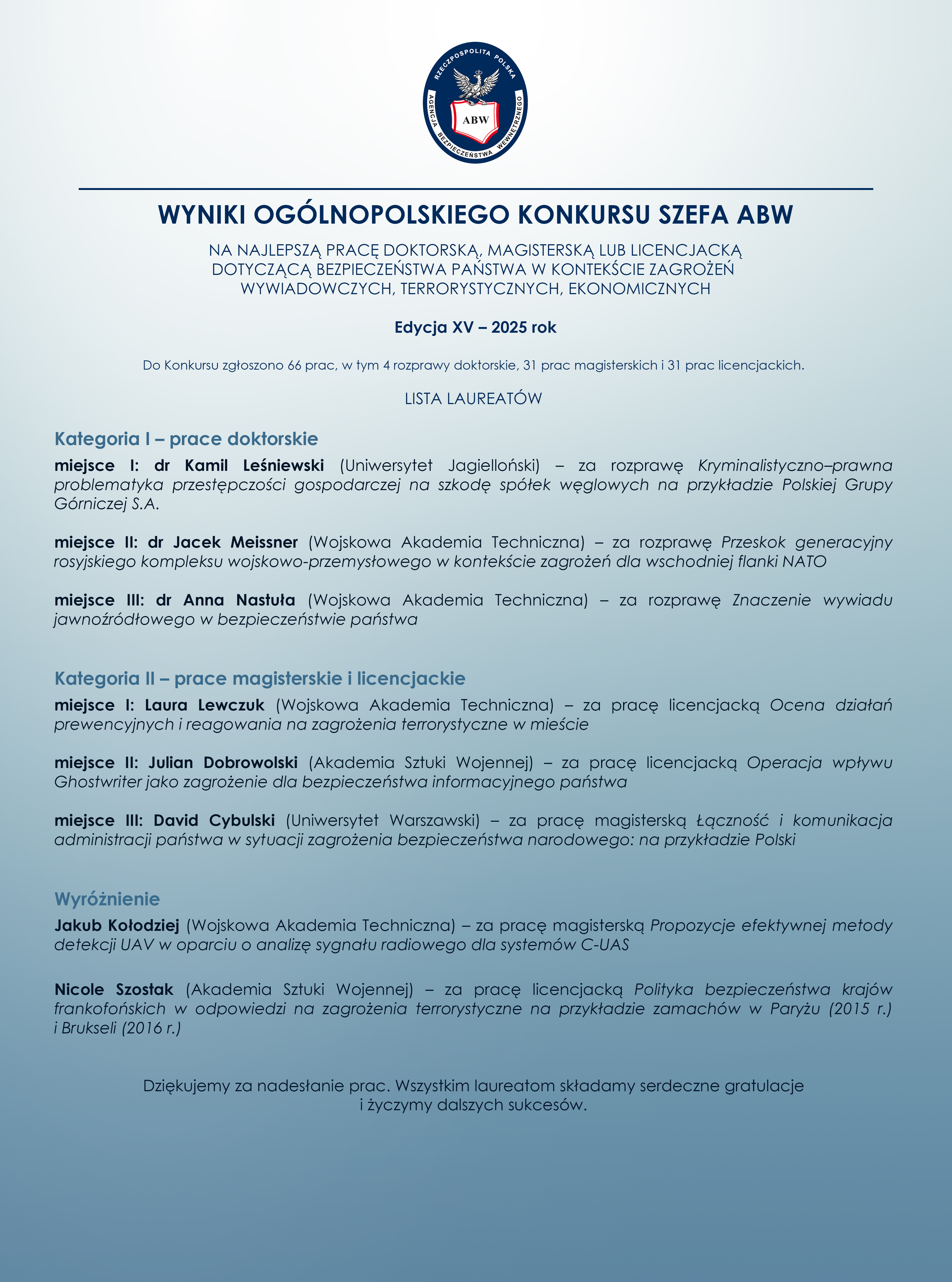 Wyniki XV edycji Ogólnopolskiego Konkursu Szefa ABW na najlepszą pracę dyplomową - Informacje